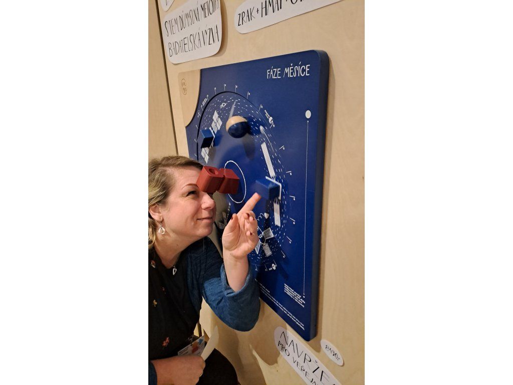 Děti sledují oběh Měsíce kolem Země, vnímají stálý směr dopadajícího světla a pomocí vestavěného kukátka pozorují, jak se mění pohled ze Země.